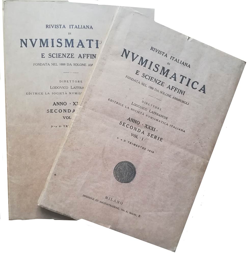 AA.VV. Rivista Italiana di Numismatica 1918 - MIRONE Salvatore, Le monete dell'antica Catana - LAFFRANCHI Lodovico, Appunti sulla Tipologia Numismatica della serie Romana Imperiale - CESANO Lorenzina, Ancora della moneta Enea corrente in Italia nel V-VI secolo d.c. - MAGNAGUTI Alessandro, Biografia Medaglistica- L'Eveneto del seicento - GEROLA Giuseppe, Noticine Mantovane - LAFFRANCHI Lodovico, Documenti Numismatici per la storia dell'Impero Romano - PALMIERI Palmieri, Contributi al Corpus Nummorum Italicorum - CUNIETTI-GONNET, Contributi al Corpus Nummorum Italicorum - LAFFRANCHI Lodovico, La pagina delle falsificazioni- I tipi di Vitellio nel bronzo falsi ed inventati - ROCCHI Francesco, In margine alla Numismatica-Saggio di patologia degli argenti antichi - LAFFRANCHI Lodovico, La monetazione di Augusto-Parte settima: Emissioni Militari in Cirenaica - MIRONE Salvatore, Il tempio di Afrodite Ericina sul denaro di L. Considio Noniano - BORRELLI N. , Dichiarazione di un piccolo nucleo di vittoriati rinvenuto in un sepolcro dell'antica Cales - DATTARI G. , Del Miliarense e della Siliqua nell'epoca Costantiniana - CORNAGGIA G. , Gli Antoniniani del III Secolo nel ripostiglio di Via Santa Maria e Stampatori a Torino - RIZZOLI Luigi, La medaglia di premio per le due prime Esposizioni di Giardinaggio(a. 1858) - POMA Cesare, A proposito della zecca di Messerano e di alcuni punzoni di monete sconosciute - CERRATO Giacinto, Di una lira di Emanuele Filiberto attribuita alla zecca di Borgo nella Bressa - CUNIETTI-GONNET, Contributi al Corpus Nummorum Italicorum - LAFFRANCHI Lodovico, La pagina delle falsificazioni- Alessandro Tiranno - DEL CORNO Tullio, Repubblica Cisalpina o Restaurazione Austro-Russa? Annata completa in due fascicoli. Pp. 335, tavv. 2, 1 tabella ripiegata.