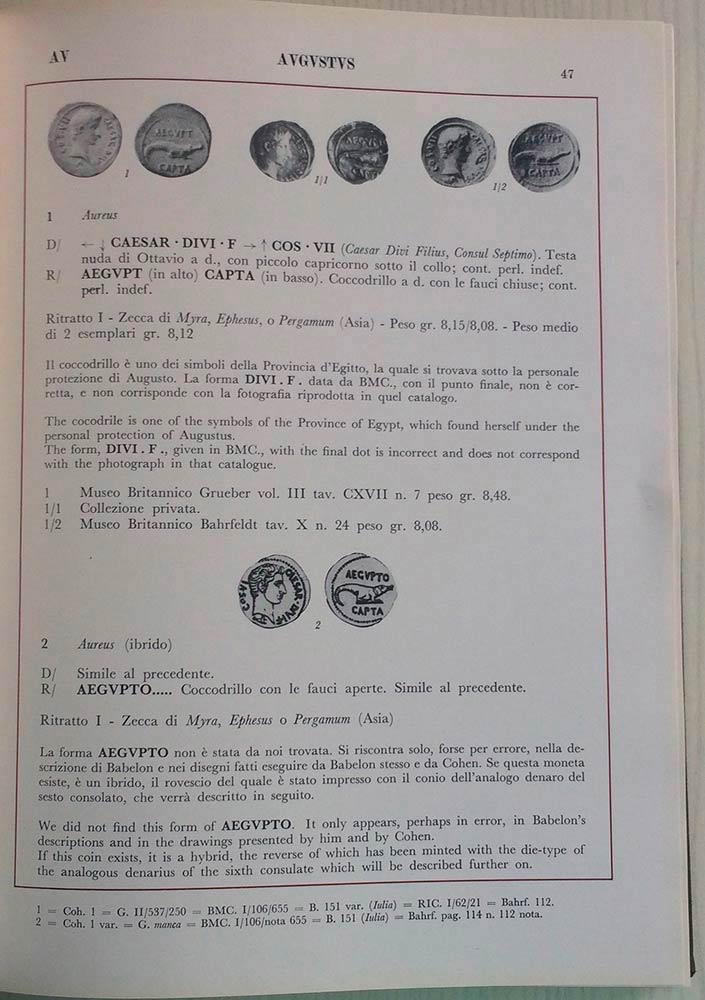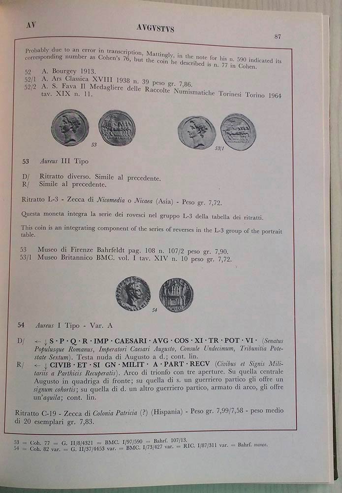 BANTI A., SIMONETTI L., Corpus Nummorum Romanorum Vol. IV – Augvstus I. Prospetto dei ritratti per l’identificazione delle zecche orientali. Monete d’oro e d’argento. Banti-Simonetti, Firenze 1974. Tela ed. pp. 307 ill. In b/n. Ot