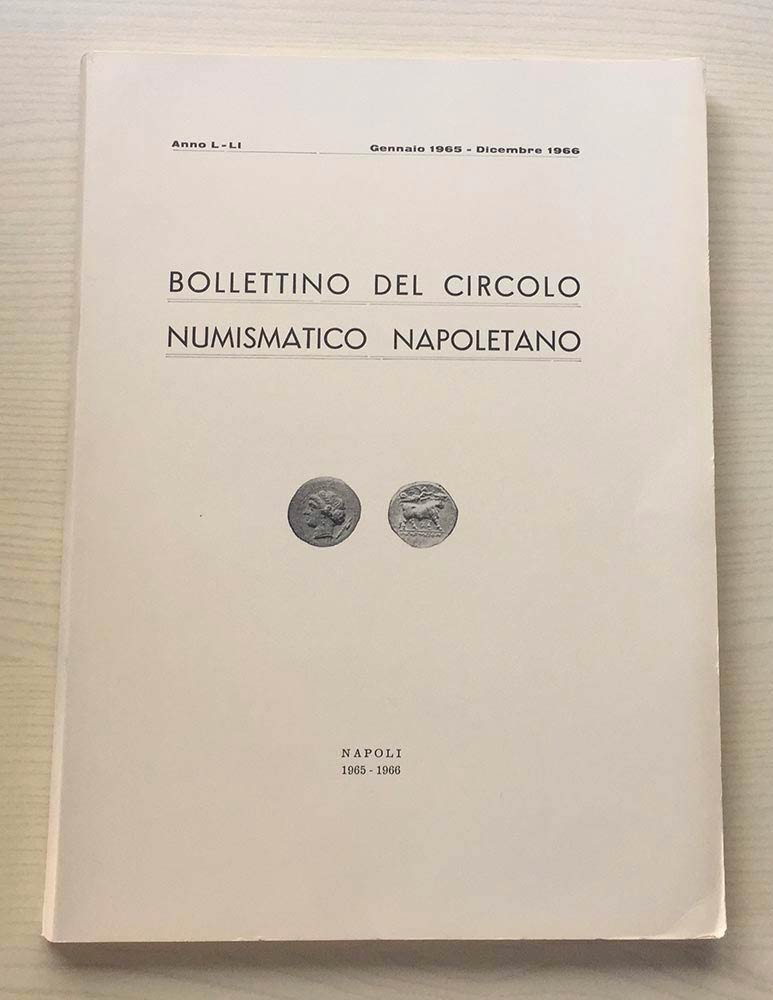 Bollettino del Circolo Numismatico Napoletano. Anno L-LI Gennaio 1965 Dicembre 1966. Brossura ed. pp. 150, tavv. 10 in b/n. Dall’Indice: Giovanni Bovi, Le monete napoletane di Filippo IV (1621-65) e di Enrico di Lorena (1648); Michele Pannuti, Le monete d'oro napoletane di Carlo e Ferdinando IV di Borbone; Agnese Catemario, Le pubbliche di Ferdinando IV di Borbone; Francesco Paolo Tinozzi, Su alcuni tipi di monete non conosciute di zecche degli Abruzzi; Roberto Volpes, La fine del Regno di Sicilia e l'unificazione dei sistemi monetari borbonici nel 1816; Renato Gaudioso, Umberto ed Amedeo di Savoia in una medaglia napoletana; Necrologio, Giovannina Majer; Elenco dei soci. Buono stato