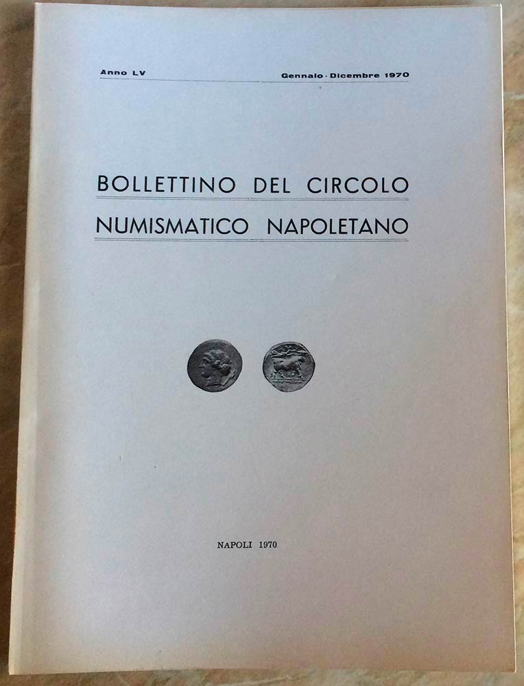 Bollettino del Circolo Numismatico Napoletano. Anno LX Gennaio- Dic. 1970 Napoli 1970. Brossura ed. 62, ill. In b/n. Indice: Siciliano T. Carlo Spinelli di Seminara munifico ricostrittore di Palmi. Bovi G. Le Medaglie per le allieve dei R. Educandati Napoletani. M. Pannuti Gaeta:25 Aprile 1806. S. Starace Pio IX a Portici. R. Gaudioso Una Medaglia Siciliana di Ferdinando II. A. Catemario Una strana Moneta. R. Volpes L' incoranazione e le prime Monete del Re Carlo di Borbone per la Sicilia. Ottimo stato