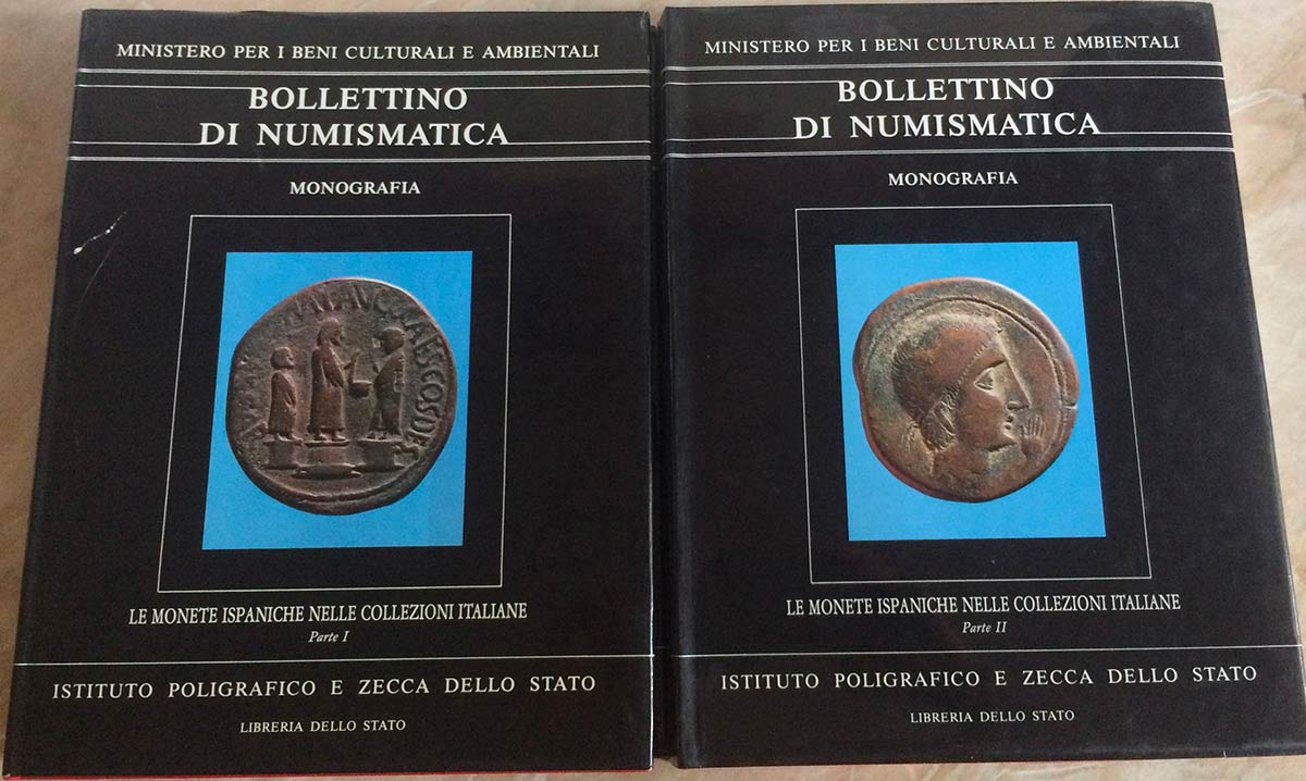Bollettino di Numismatica , Le monete Ispaniche nelle collezioni Italiane parte I-II – Anno 1986. Istituto poligrafico e zecca dello stato. Tela editoriale con sovraccoperta illustrata , pp. 206 ,437 illustrazioni nel testo e catalogo delle monete. Ottimo stato