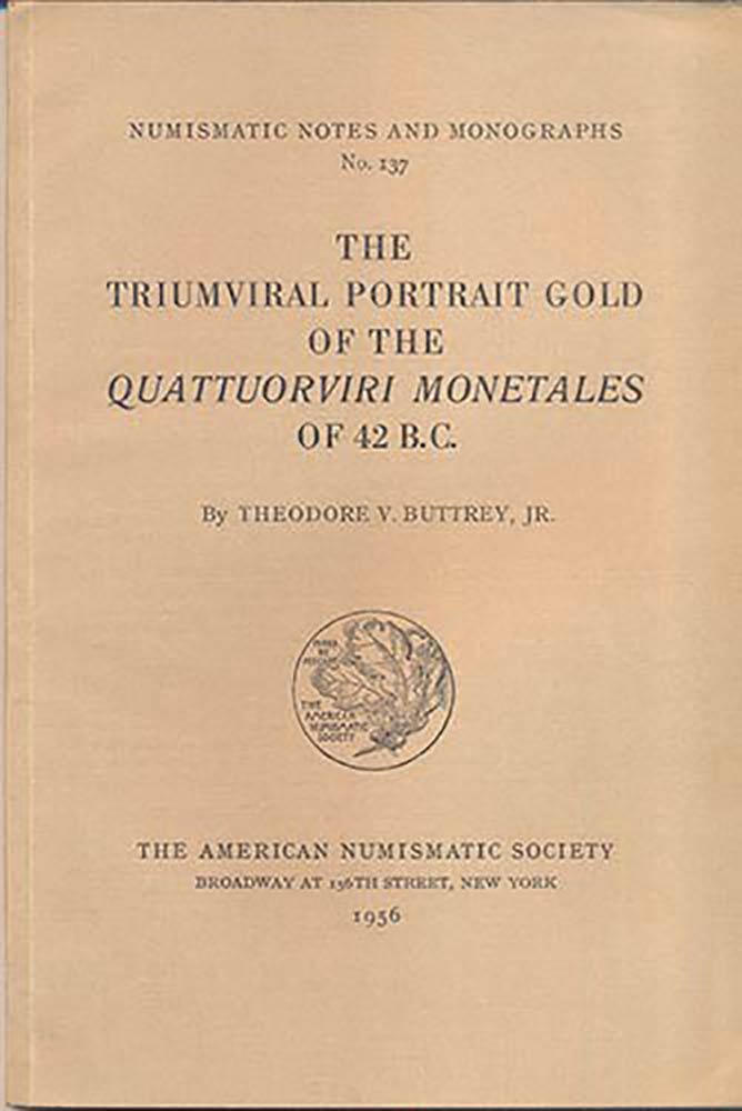 BUTTREY Theodore V. The Triumviral Portraits Gold of the Quattuoviri Monetale of 42 B.C. New York, 1956. Legatura editoriale, pp. 69, pl. 9. important and RARO