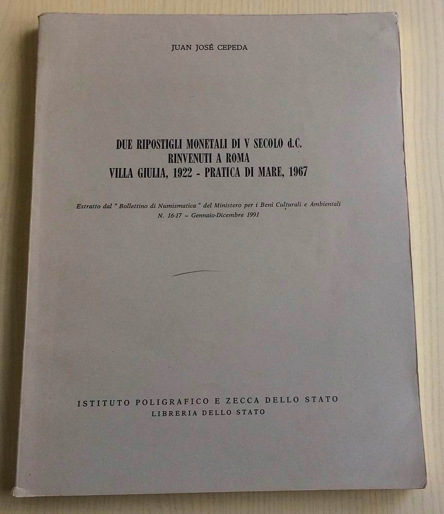 CepedaJ.J. Due Ripostigli Monetali di V secolo d.c. Rinvenuti a Roma Villa Giulia, 1922 – Pratica di mare, 1967. Estratto dal “Bollettino di Numismatica” del Ministero per i beni Culturali e Ambientali No. 16-17 – Gennaio-Dicembre 1991. Brossura ed. pp. 199, ill. in b/n. Buono stato