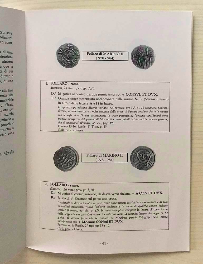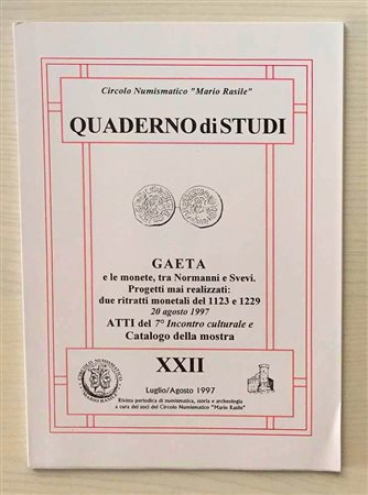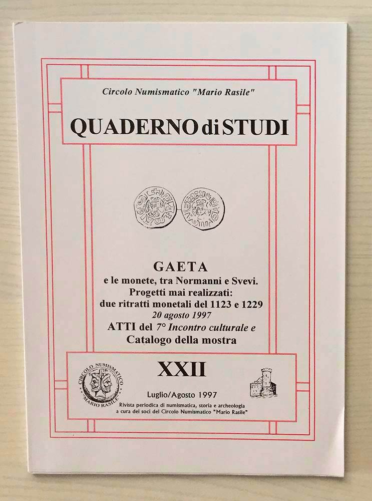 Circolo Numismatico “Mario Rasile” Quaderno di studi XXII , Formia Luglio-Agosto 1997. Gaeta e le Monete tra Normanni e Svevi. Progetti mai realizzati: due ritratti monetali del 1123 e 1229.\Atti del & incontro culturale e Catalogo della mostra. Brossura ed., pp. 52, illustrazioni n.t. Catalogo di selezione- studio di alcune Monete di Gaeta. ( X-XIII sec. ). Nuovo