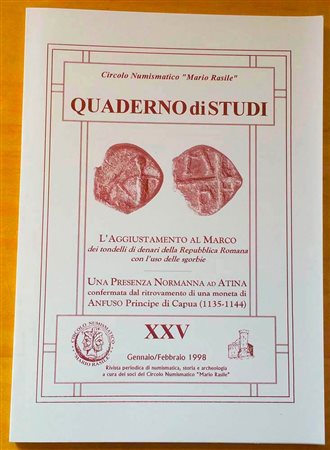 Circolo Numismatico “Mario Rasile” Quaderno di studi XXV. Formia Gennaio-Febbraio 1998. L' aggiustamento al Marco dei tondelli di Denari della Repubblica Romana con l'uso delle Sgorbie. Una presenza Normanna ad Atina confermata dal ritrovamento di una Moneta di Anfuso Principe di Capua (1135-1144). Brossura ed., pp. 36, tavv. 2 illustrazioni n.t. Nuovo
