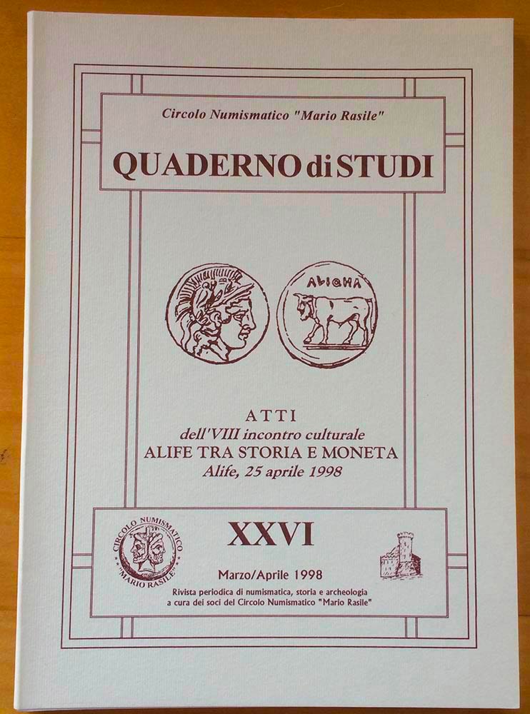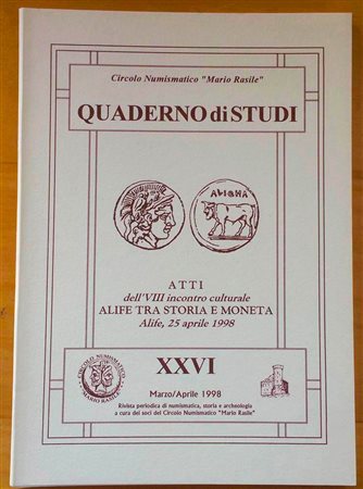 Circolo Numismatico “Mario Rasile” Quaderno di studi XXVI Formia, Marzo-Aprile 1998 . Atti dell'VIII incontro culturale Alife tra storia e moneta. Alife, 25 aprile 1998.. Brossura ed., pp. 36, illustrazioni n/t. Nuovo