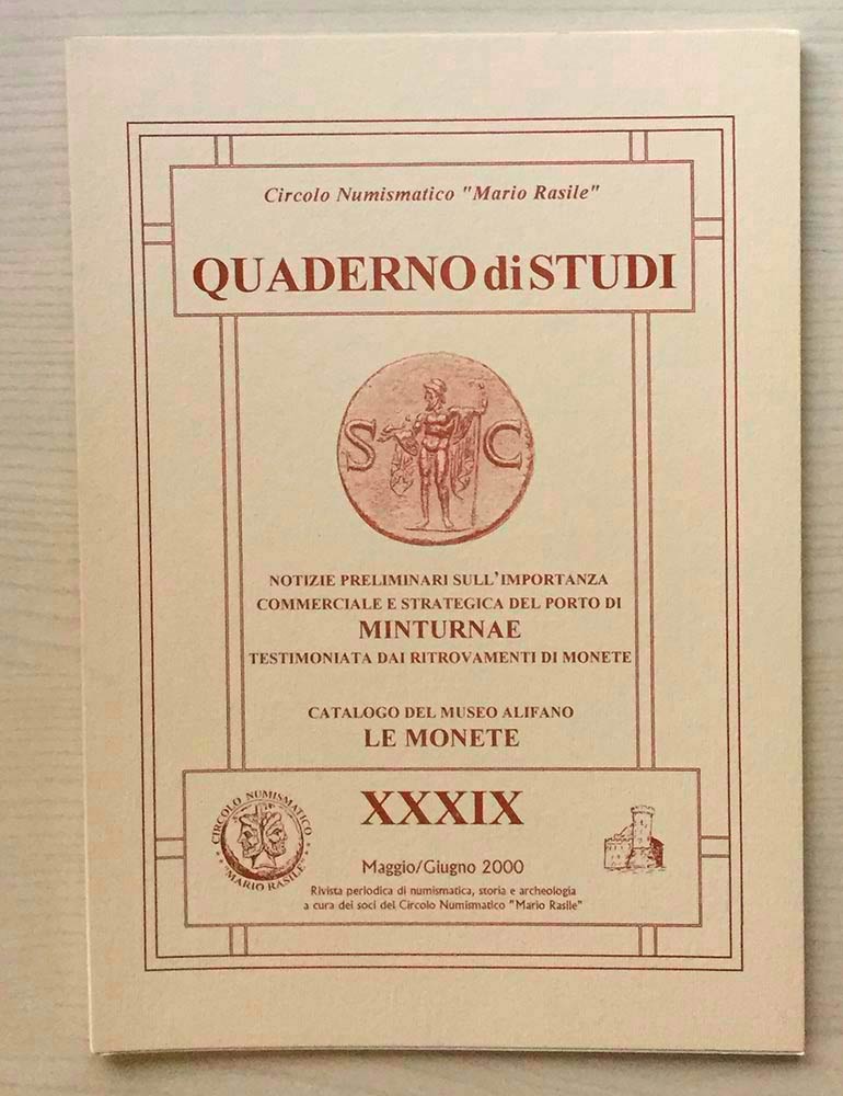 Circolo Numismatico “Mario Rasile” Quaderno di studi XXXIX. Formia Maggio-Giugno 2000 Notizie preliminari sull'importanza commerciale e strategica del porto di Minturnae testimoniata dai ritrovamenti di monete. - Catalogo del Museo Alifano. Le monete. .Brossura ed., pp. 40, numerose ill. n/t . Nuovo