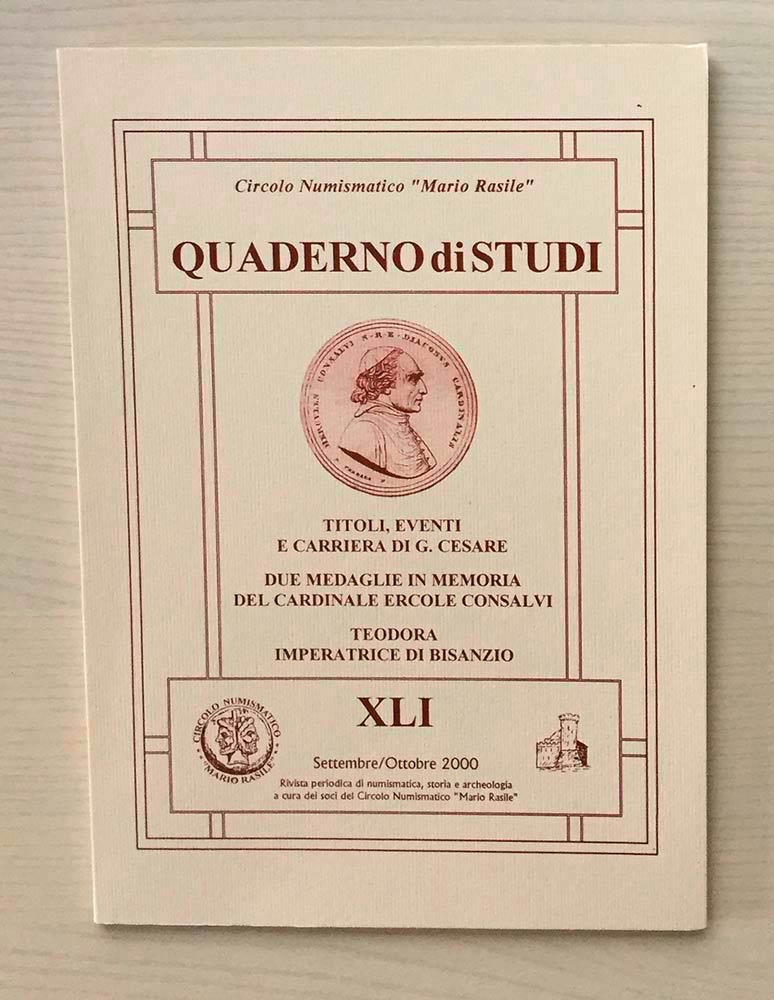 Circolo Numismatico “Mario Rasile” Quaderno di studi XLI , Formia, Settembre-Ottobre 2000. Titoli Eventi e Carriere di G. Cesare. Due Medaglie in memoria del Cardinale Ercole Consalvi. Teodora Imperatrice di Bisanzio. Brossura ed.