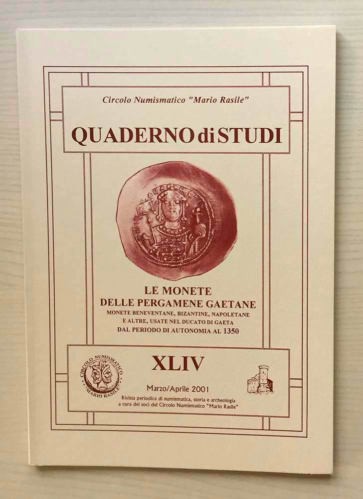 Circolo Numismatico “Mario Rasile” Quaderno di studi XLIV, Formia, Marzo-Aprile 2001. Le Monete delle Pergamene Gaetane. Monete Beneventane, Bizantine, Napoletane e altre, usate nel Ducato di Gaeta dal periodo di autonomia al 1350.. Brossura ed., pp. 102, illustrazioni n/t. Nuovo