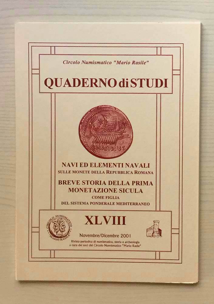 Circolo Numismatico Mario Rasile .Quaderno di studi XLVIII, Formia, Novembre-Dicembre 2001 Navi ed elementi Navali, sulle Monete della Repubblica Romana. Breve storia della prima Monetazione Sicula, come figlia del Sistema Ponderale Mediterraneo. Brossura ed., pp. 38, numerose illustrazioni n/t. Nuovo.