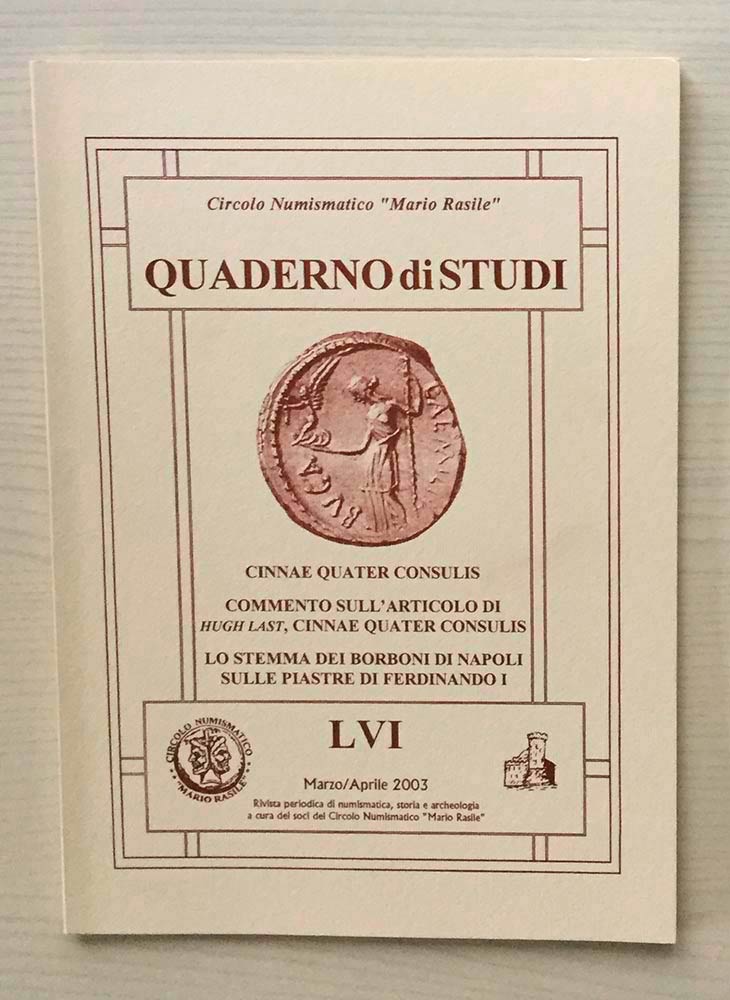 Circolo Numismatico “Mario Rasile” Quaderno di studi LVI, Formia, Marzo-Aprile 2003. Cinnae Quarter Consulis. Commento sull'articolo di Hugh Last. Lo Stemma dei Borboni di Napoli sulle Piastre di Ferdinando I. Brossura ed., pp. 34, illustrazioni n/t. Nuovo