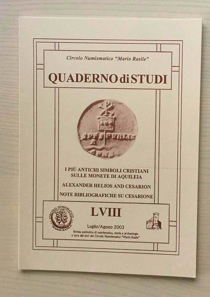 Circolo Numismatico “Mario Rasile” Quaderno di studi LVIII, Formia, Luglio-agosto 2003 I più Antichi Simboli Cristiani sulle Monete di Aquileia. Alexander Helios and Cesarion. Note Bibliografiche su Cesarione. Brossura ed. pp.40, ill. in b/n. Nuovo