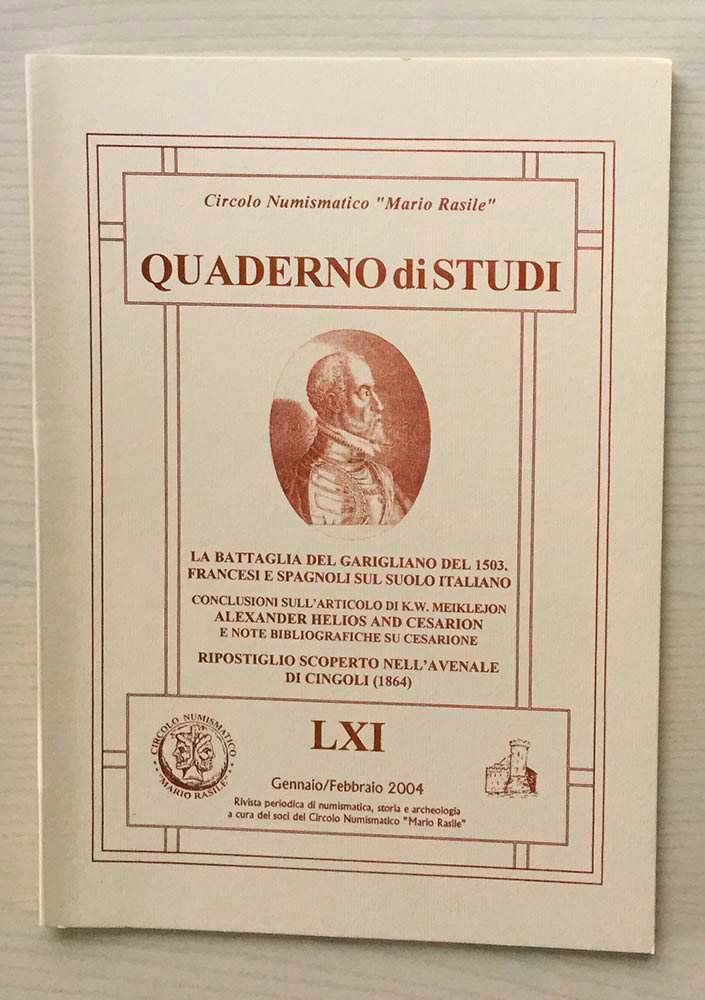 Circolo Numismatico “Mario Rasile” Quaderno di studi LXI, Formia, Gennaio- Febbraio 2004. La Battaglia del Garigliano del 1503. Francesi e Spagnoli sul suolo Italiano. Conclusioni sull'articolo di K.W. Meiklejon Alexander Helios and Cesarion e note bibliografiche su Cesarione. Ripostiglio scoperto nell'Avenale di Cingoli (1864). Brossura ed., pp. 24, numerose illustrazioni n/t. Nuovo
