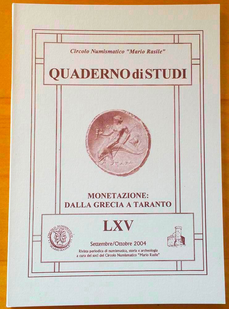 Circolo Numismatico “Mario Rasile” Quaderno di studi LXV. Formia, Settembre- Ottobre 2004 . Monetazione: Dalla Grecia a Taranto. Brossura ed., pp. 40, tavv. XVII,. Nuovo.