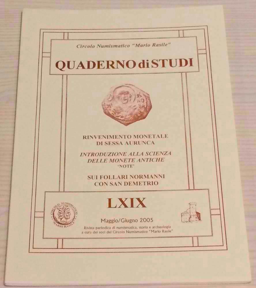 Circolo Numismatico “Mario Rasile” Quaderno di studi LXIX, Formia,Maggio- Giugno 2005. Rinvenimento Monetale di Sessa Aurunca. Introduzione alla scienza delle Monete Antiche “ Note”. Sui Follari Normanni con San Demetrio. Brossura ed., pp. 40, illustrazioni n/t. Nuovo