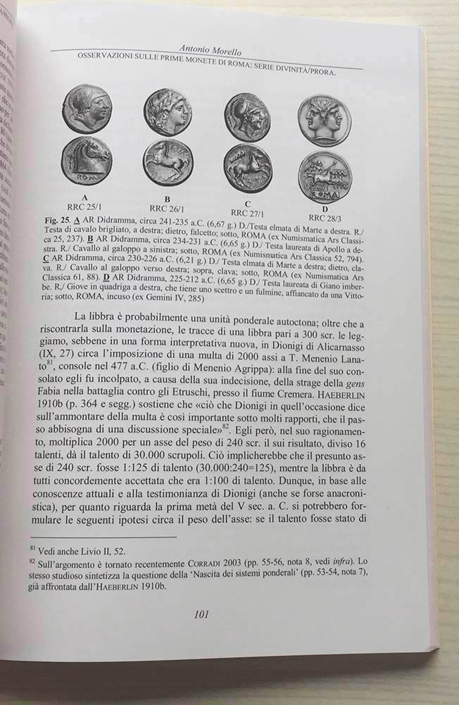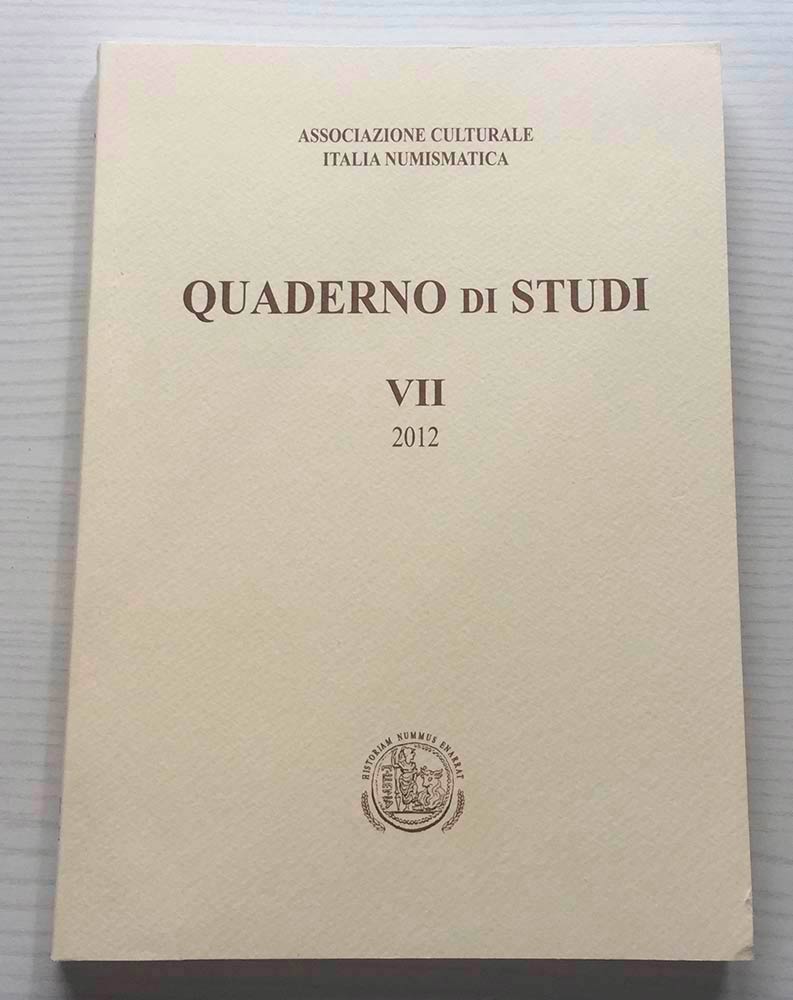 Circolo Numismatico “Mario Rasile” Quaderno di studi VII Editrice Diana 2012. Brossura ed. pp. 188, ill. in b/n .Il volume è stato interamente dedicato ad Andrea Morello, storico Presidente dell’Associazione, scomparso nel febbraio del 2011. Le prime quattro pagine sono un breve ricordo della Persona, scritte dai figli Antonio e Francesco; segue la bibliografia relativa ai lavori prodotti da Andrea, dal 1994 al 2009, prevalentemente pubblicati per l’Associazione che presiedeva e per la rivista Monete Antiche. Il primo studio, è opera di Alberto d’Andrea che analizza la tipologia delle monete emesse dalla zecca di Cuma tra il V e il IV secolo a.C. La sintesi è molto ben strutturata e, nella parte introduttiva, l’Autore ha esposto le motivazioni della divisione in quattro serie (o periodi) della monetazione dell’ antica città; segue il catalogo delle varie tipologie e la relativa bibliografia. In questo volume sono stati inseriti alcuni scritti di Andrea Morello che furono editi sulla rivista Monete Antiche; tale iniziativa nasce dalla volontà di ricordare ai soci dell’ACIN come egli fosse uno studioso prolifico, ma anche il Suo modo semplice di rivolgersi a chiunque, tramite i suoi studi. Ad esempio, in quattro sintetiche ma efficaci pagine, egli si soffermò su “Due stateri di Taranto firmati da Kal.. raffinato incisore di monete della Magna Grecia”. Chi ebbe la fortuna di conoscere Andrea, sapeva bene che tra i suoi pensieri persistenti c’era la volontà di spettivamente Livia, Antonia, Livilla (o Vipsania). Tale proposta non è inedita ma l’Autrice ne approfondisce alcuni aspetti con paragoni iconografici e notizie storiche che ne avvalorerebbero le sue pertinenti conclusioni. Raffaele Iula approfondisce “Il profilo di Giulia Drusilla” con un’attenta “Analisi storiografica e numismatica per una ridefinizione del suo ruolo storico-sociale”. Questo lavoro è integrato con interessanti immagini monetali e una dettagliata bibliografia. Alberto Trivero Rivera, a seguito di molte discussioni aperte nei forum numismatici online, scrive un contributo dedicato a “L’orbis terrarum nella monetazione romana” approfondendo la rappresentazione del globo, in particolare, sulle emissioni imperiali; pregevoli illustrazioni a corredo, fanno di questo lavoro un interessante riferimento, offrendosi con una lettura avvincente. L’articolo di chiusura è di Andrea Morello: “Iconografia paleocristiana sulle monete romane tardo antiche: la Fenice”, già edito sulla rivista Monete Antiche e qui riproposto affinché fosse ricordato un bel lavoro, che fu tanto caro all’Autore. Nuovo