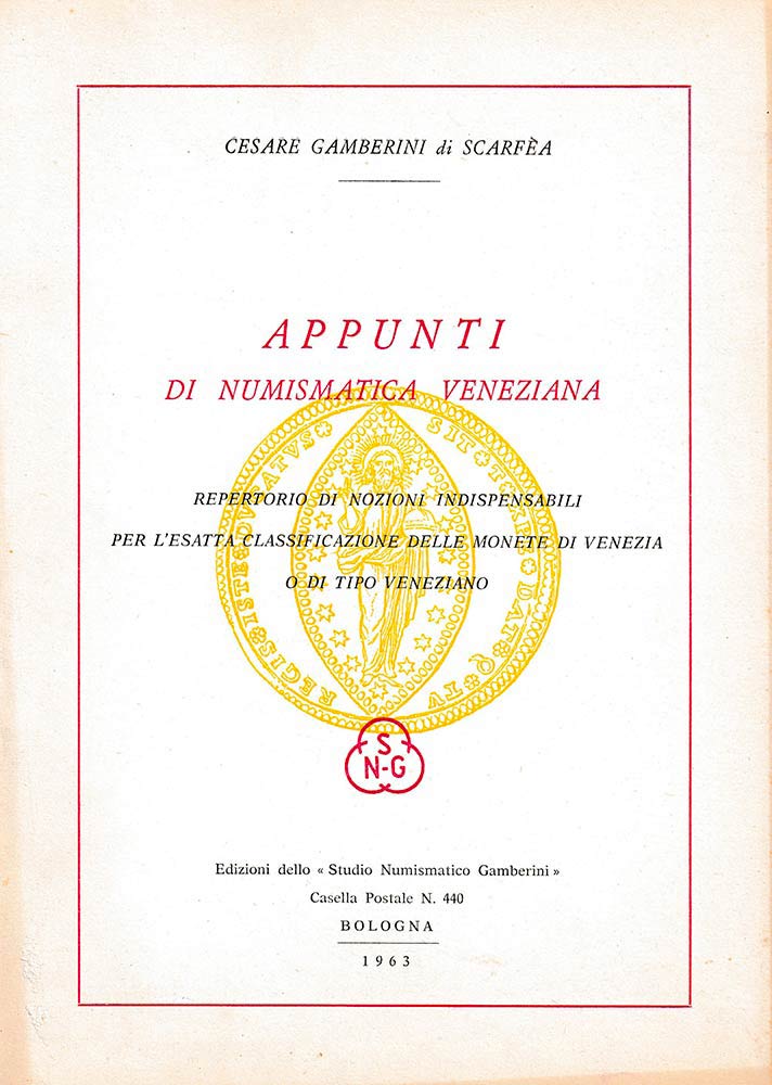 Gamberini di Scarfea C., Appunti di Numismatica Veneziana. Repertorio di Nozioni Indispensabili per l’Esatta Classificazione delle Monete di Venezia o di Tipo Veneziano. Edizioni dello “Studio Numismatico Gamberini”, Bologna 1963. Softcover, 78pp., line drawings, Italian text. Limited edition, copy no. 96 of 500. Very good condition
