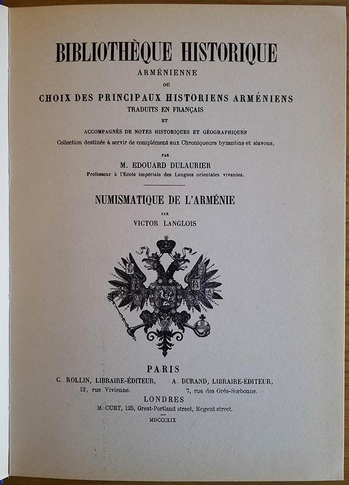 Langlois V., Numismatique de l'Arménie. Forni reprint, 1979. Hardcover, 87pp., 4 plates of line drawings. Very good condition
