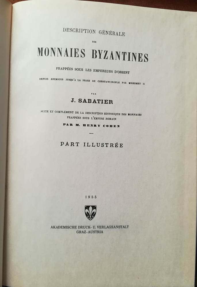 SABATIER J. – Description generale des monnaies byzantines, frappées sous les empereurs d’Orient, depuis Arcadius, jusqu’à la prise de Constantinople par Mahomet II: suite et complément de la description historique des monnaies frappées sous l’Empire romain par Henry Cohen. Graz, 1955. pp. XIII, + tavv. 70. Ristampa anastatica dell’edizione originale di Paris & Londres, 1862