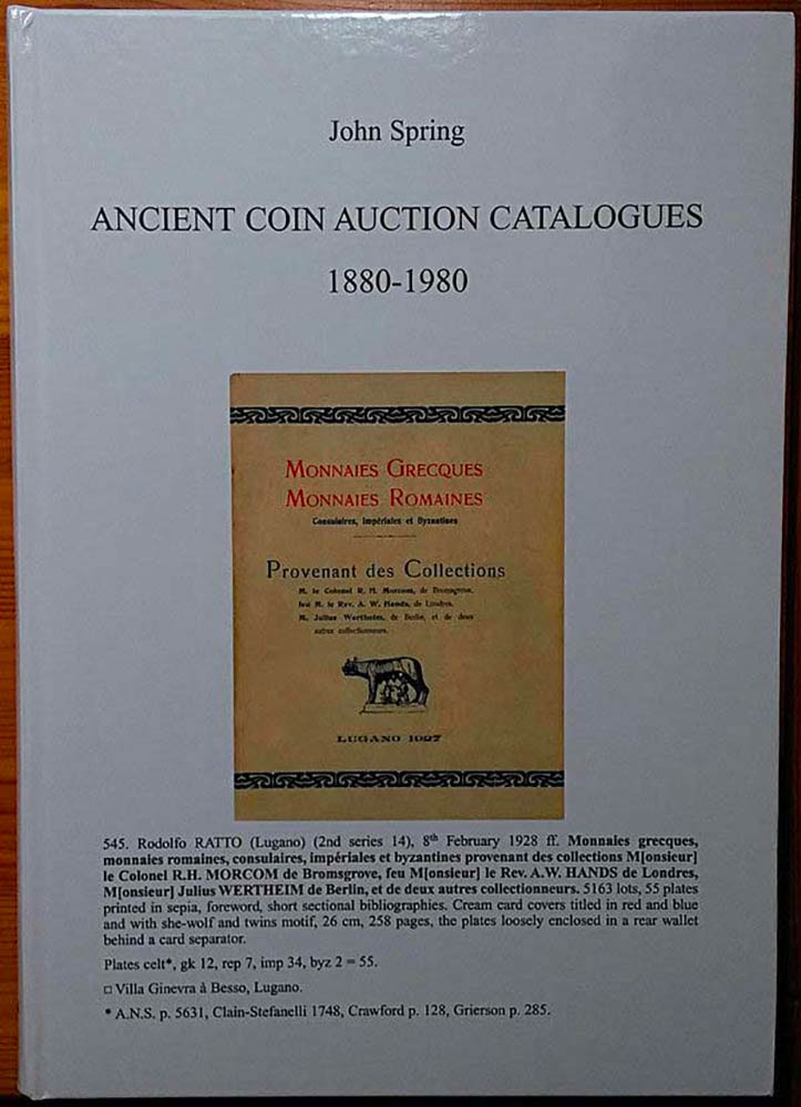 Spring J., Ancient Coin Auction Catalogues, 1880-1980. Spink, London 2009. Hardbound, 374pp. This listing of 886 ancient coin auction catalogues aims to include every important sale of ancient coins, which took place between 1 Jan
