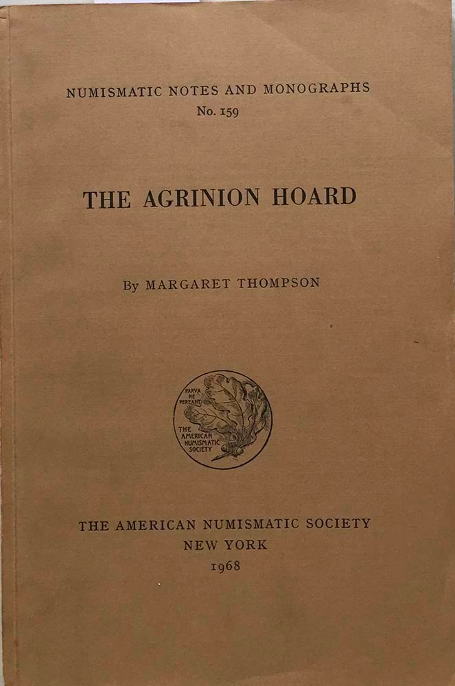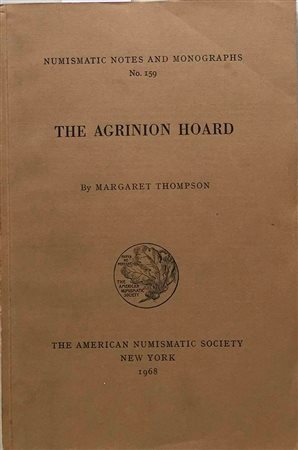 Thompson M. Numismatic Notes and Monographs No. 159. The Agrinion Hoard. The American Numismatic Society , New York 1968. Brossura ed. pp. 130, tavv. LVI. Buono stato.
