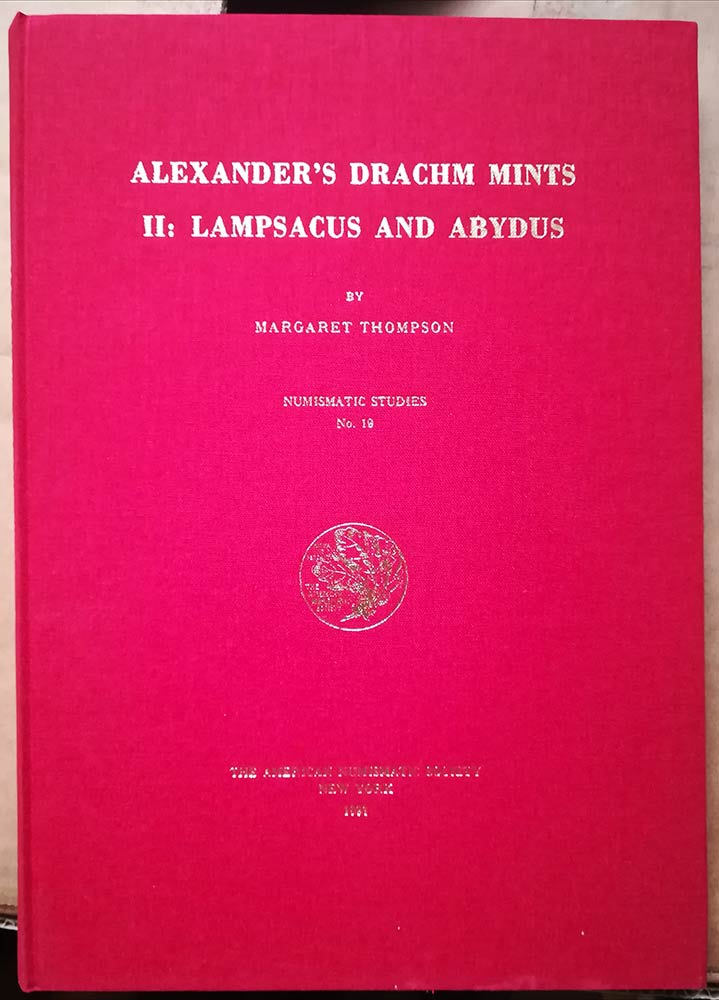 THOMPSON M. - 4. ALEXANDER'S DRACHM MINTS II: LAMPSACUS AND ABYDUS - Numismatic Studies No. 19, New York, American Numismatic Society, 1991. 77 pages of text plus 34 exceptional plates. Red cloth, New copy. The second of two books by Margaret Thompson dealing with Alexander's Drachm Mints. Book covers the mints of LAMPSACUS AND ABYDUS and provides attributions, catalogues and commentaries, synopses of the coinage and chronology. Along with the silver drachms included is gold coinage produced by Lampsacus and Abydus mints.