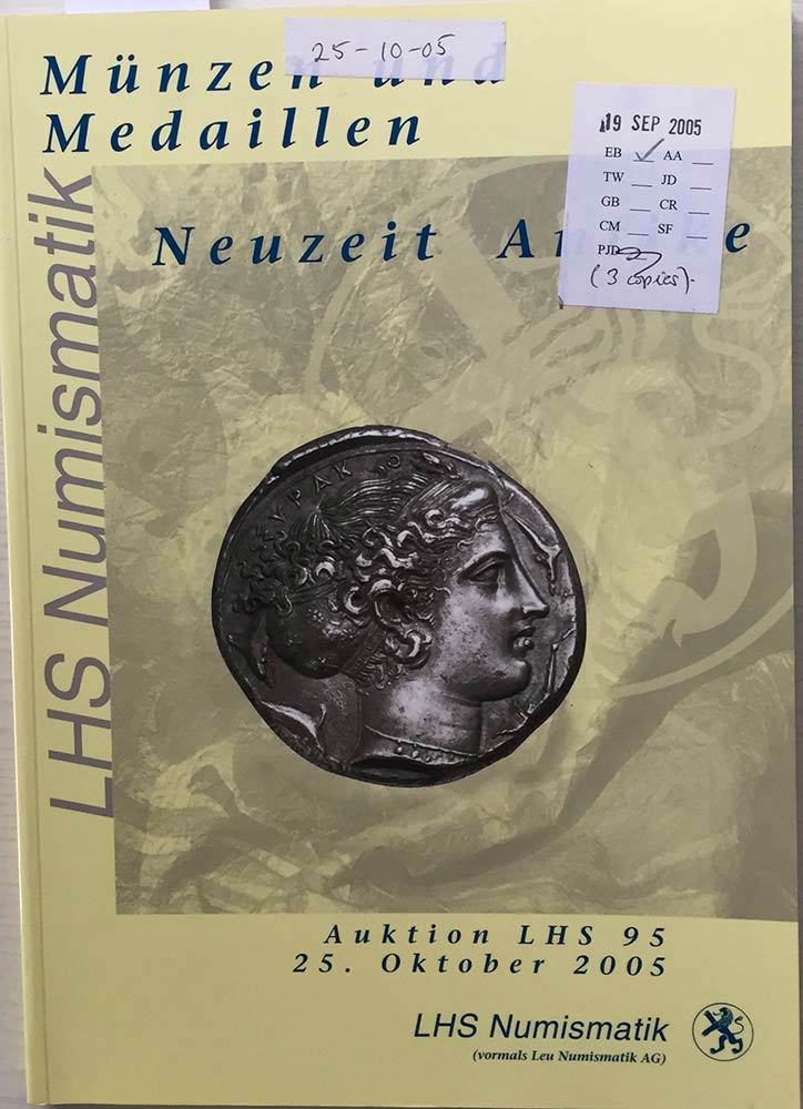 LHS Numismatik Auktion 95. Munzen und Medaillen, Mittelalter Neuzeit. Munzen der Antike. Deutschland, Frankreich, Grossbritannien, Italien, Romisch-Deutsches Reich, Russland, Schweiz, Spanien. Ancient Celtic, Greek, Roman and Byzantine Coins. Zurich 25 Oktober 2005. Brossura ed. pp. 191, lotti 867, ill. in b/n. Ottimo stato