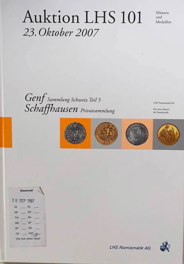 LHS Numismatik Auction 101 Munzen und Medaillen, Genf (Sammlung Schweiz Teil 5). Schaffhausen (Privatsammlung). Zurich 23 Oktober 2007. Cartonato ed. pp. 68, lotti 343, ill. a colori. Ottimo stato.