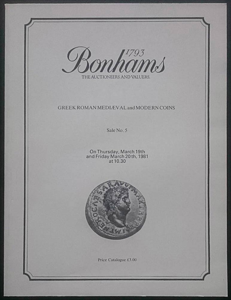 Bonhams in association with V.C. Vecchi & Sons. Sale No. 5. Greek, Roman Medieval and Modern Coins. Londra, 19-20 Marzo 1981. Brossura editoriale, 785 lotti, tavole B/N. Buone condizioni