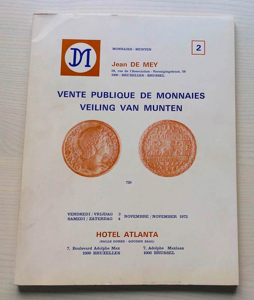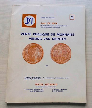 De Mey J. Auction 2 Importante Vente de Monnaies. Brussel 03-04 Novembre 1972. Brossura ed. pp. 63, lotti 1422, tavv. 15 in b/n. Buono stato