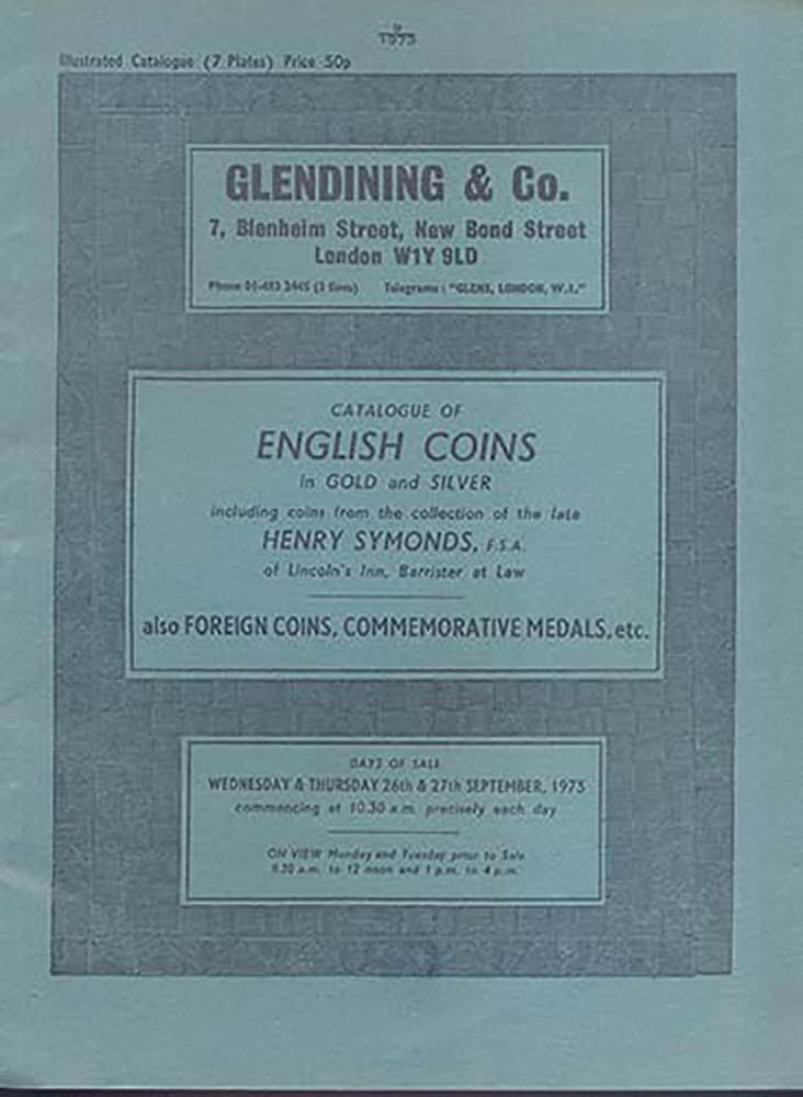 GLENDINING & Co. London 26-27/9/1973. Catalogue of English coins in gold und silver including coins from the collection of the late Henry Symonds, f.s.a. of Lincoln's Inn, Barrister at Law. Also foreign coins, commemorative medals