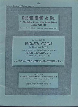 GLENDINING & Co. London 26-27/9/1973. Catalogue of English coins in gold und silver including coins from the collection of the late Henry Symonds, f.s.a. of Lincoln's Inn, Barrister at Law. Also foreign coins, commemorative medals. Editorial binding, pp.56, lotti 696, tavv. 7.