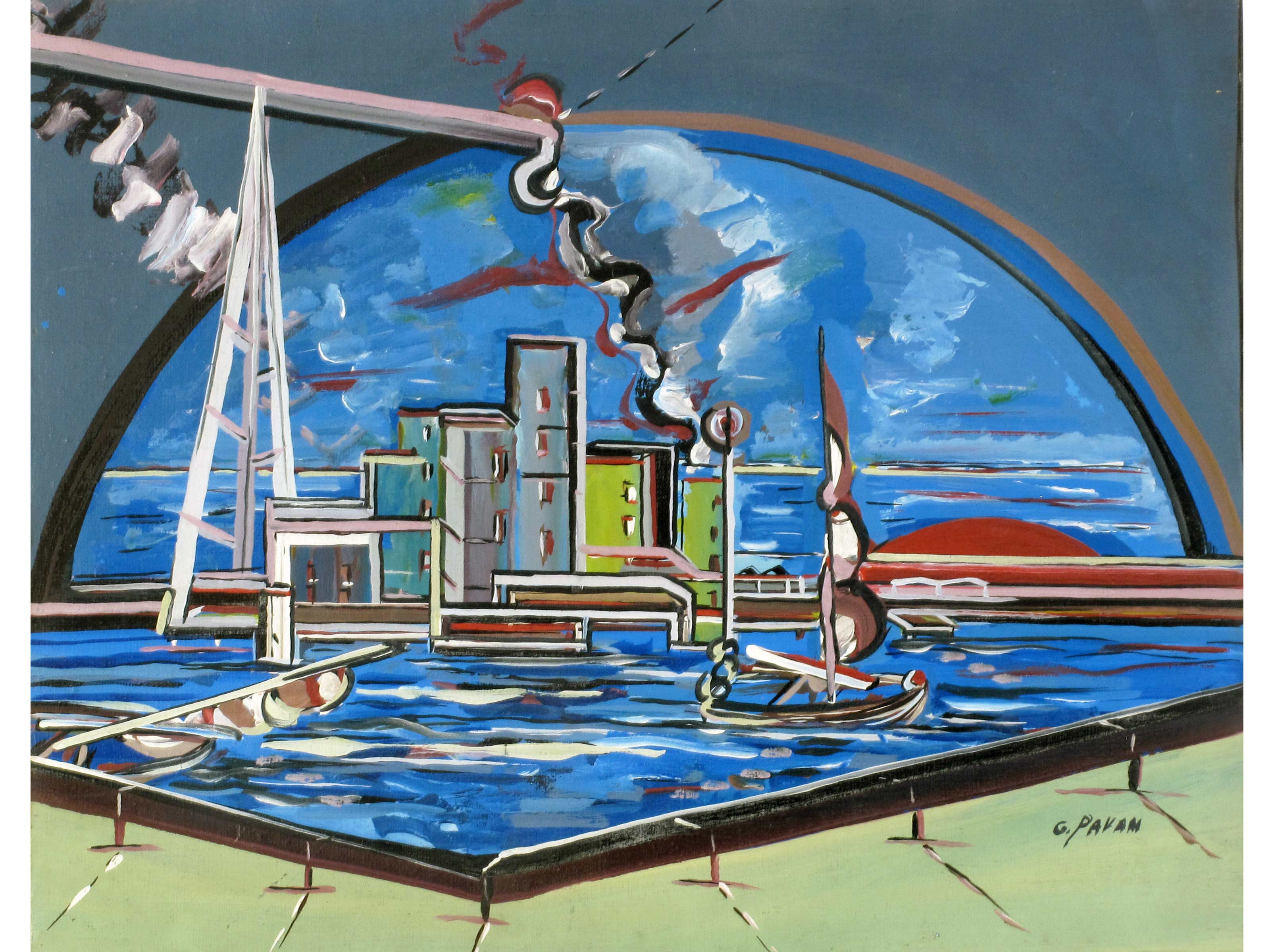 Giordano Pavan (Adria 1926) Cantiere Olio su tela Firmato e dedicato a tergo...