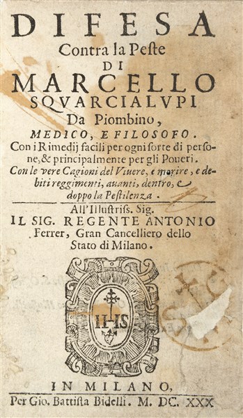 [PESTE] - SQUARCIALUPI Marcello (1538-1592) - Difesa contra la peste di Marcello Squarcialupi da Piombino medico e filosofo. Con i rimedii facili per ogni sorte di persone, & principalmente per gli poveri. Con le vere cagioni del vivere, e morire, e debiti reggimenti, avanti, dentro, e doppo la pestilenza. Milan: Giovan Battista Bidelli, 1630.