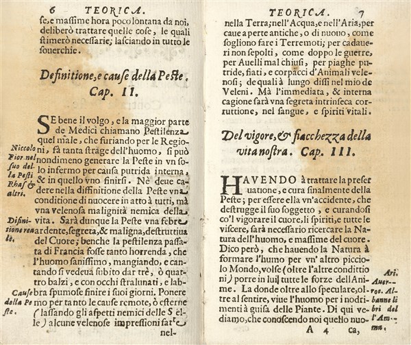 Interessante edizione di questo libro sui rimedi contro la peste pubblicato per la prima volta nel 1565, ma riedito durante la celebre peste milanese del 1630 che venne poi ricordata in particolare per il ruolo centrale ne I Promessi Sposi del Manzoni. "Sarà dunque la peste una febbre ardente, segreta, & maligna, destruttiva del cuore; benche la pestilenza passata di Francia fosse tanto horrenda, che l'huomo sanissimo, mangiando e cantando si vedeva subito dar tré, ò quattro balzi, e con occhi stralunati, e labbra spumose finire i suoi giorni".