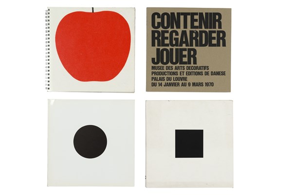 Nel lotto anche: Contenir Regarder Jouer. Parigi: Centre Creation Industrielle; Musee Des Arts Decoratifs, 1970 - MARI, Iela ed Enzo. La mela e la farfalla. Milano: Casa Editrice Valentino Bompiani, 1964. Esemplare distribuito da Eric Diefenbronner nel settembre del 1964 con la data 1964 cancellata ad inchiostro e accompagnato da un doppio foglietto volante con testo svedese (senza astuccio).