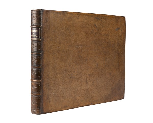 Folio oblungo (290 x 405mm). Frontespizio entro doppia cornice, secondo frontespizio inciso con veduta panoramica di Venezia e dedica al Doge Luigi Mocenigo datata 27 maggio 1703, 101 tavole non numerate e incise in rame da Carlevaris, fra le tavole 38 e 39 vi è aggiunta una tavola raffigurante la Scuola dello Spirito Santo su le Zatere di formato leggermente più piccolo, tutte le tavole sono nel primo stato non numerate tranne le tavole n. 82, 86, 98 che sono in seconda tiratura con numerazione in lastra all'angolo inferiore destro (circa una decina di tavole al centro con lieve macchia di umidità al margine inferiore e poche altre tavole in fine con macchia più piccola, ma più scura). Pelle a spruzzo coeva, tagli a spruzzo (reindorsata con dorso moderno). Provenienza: William Clavering-Cowper, Conte di Cowper (1709-1764, exlibris alle armi) - A.J. Kant (exlibris).