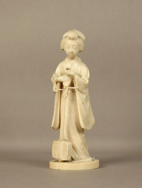 Firmato, datato. Scultura in avorio raff. ''SUONATRICE DI LIUTO''. Marcata sotto la base. Cina. Inizi XX secolo. Mis. Alt. cm. 19 ca.