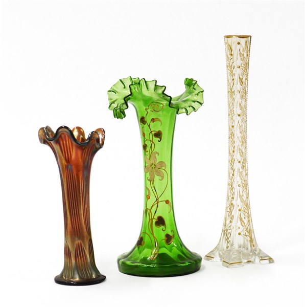 Lotto composto da tre vasi di epoche e manifatture differenti, dei quali uno in vetro trasparente incolore con decorazioni dorate, uno in vetro trasparente verde con decori floreali e uno in vetro iridescente. (h max cm 40,5) (lievi difetti)