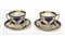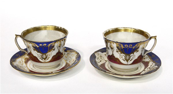 Coppia di tazze con piattini in porcellana decorata in policromia nei toni del blu e prugna con fregi dorati. Secolo XIX (restauri)