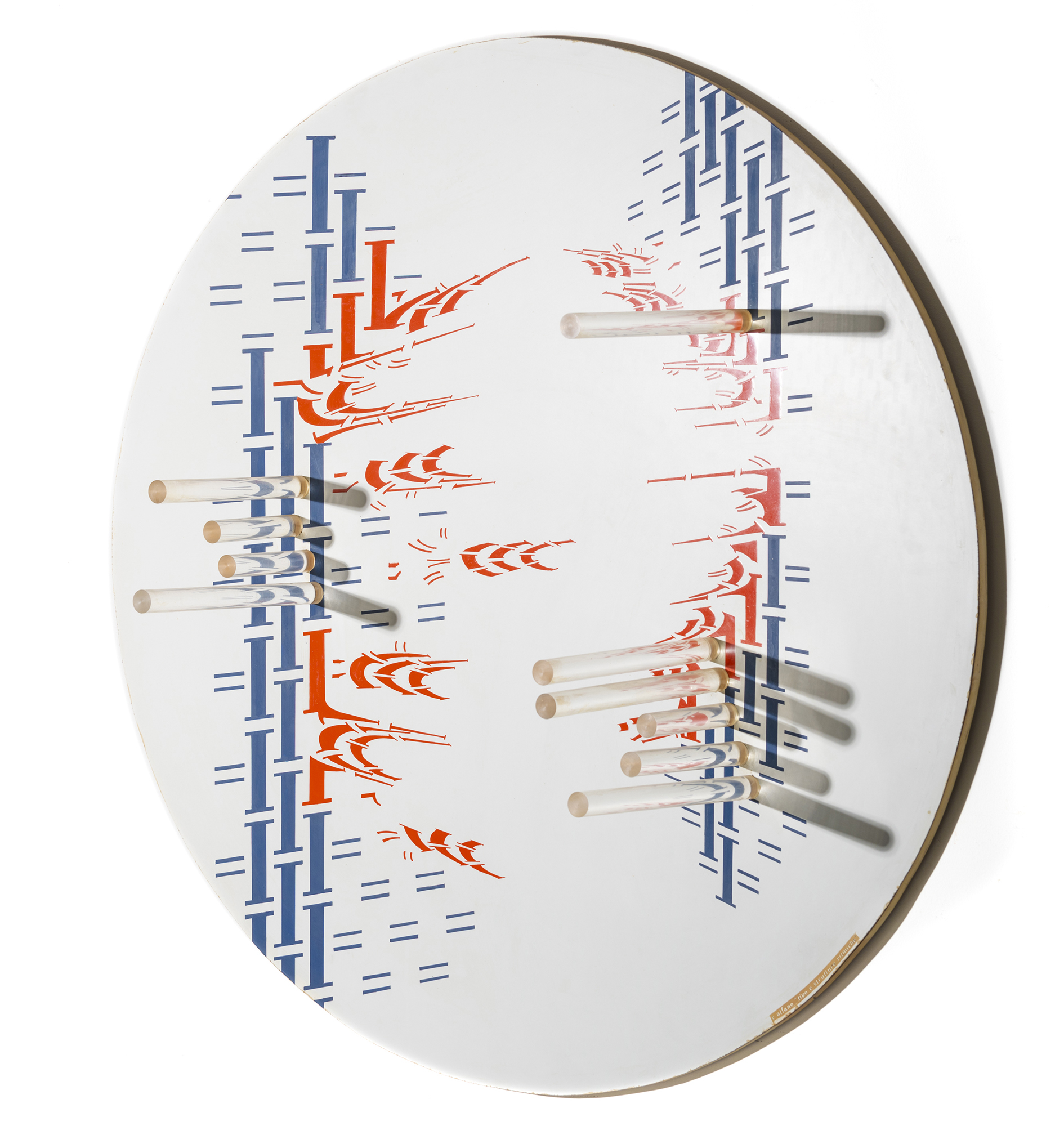 Pittura e cilindri in plexiglas su tavola, diametro cm. 108,5, profondità cm. 28,5