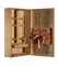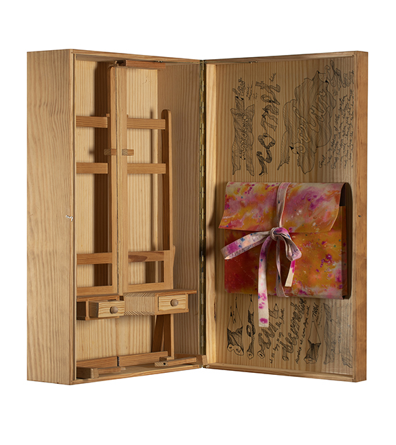 Cavalletto in legno, inchiostro, specchio, borsa in stoffa dipinta e cassa di legno, cm. 87,5 x 53,5 x 21,5 chiuso - cm. 87,5 x 92 x 52 aperto