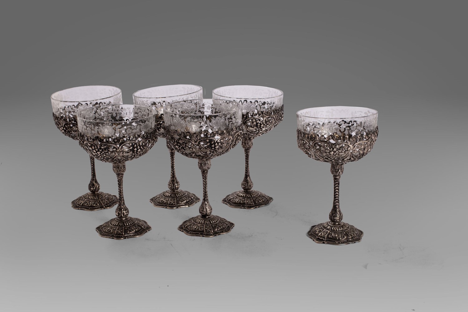 Servizio da sei coppe da champagne in cristallo e argento 800, Germania fine secolo XIX - inizi secolo XX