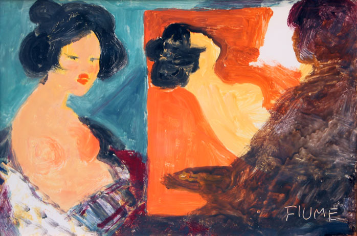 FIUME Salvatore (Comiso (Rg) 1915 - Canzo (Co) 1997) Giapponesina nello studio olio su masonite, cm. 30 x 45 Firma 'Fiume' (in basso a destra) Autentica dell'artista su fotografia, con certificato di D.L. Arte, Milano Certificate issued by the artist, with the certificate of the D.L. Arte, Milano