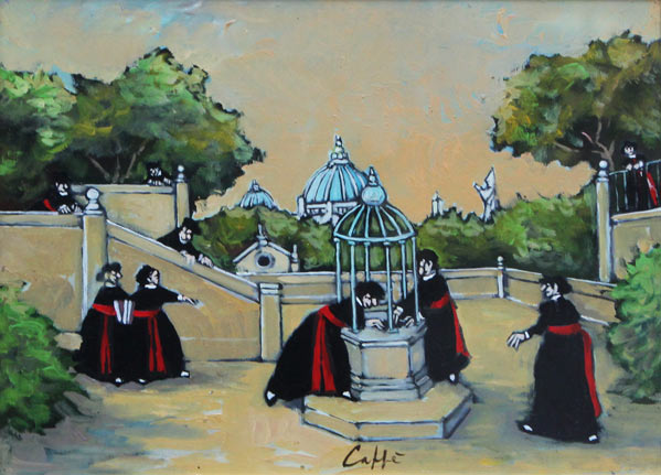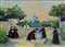 CAFFE' Nino (Alfedena 1909 - Pesaro 1975) Davanti al bagno, 1969 olio su tavola, cm. 17.8 x 23.5 Firma 'Caffè' (in basso al centro) #Etichetta dell'archivio Nino Caffè (al retro) Autentica dell'archivio Nino Caffè, a cura di Giorgio Borghi, con n° P/2071PB Certificate of the archieve Nino Caffè, by Giorgio Borghi, under no. P/2071PB