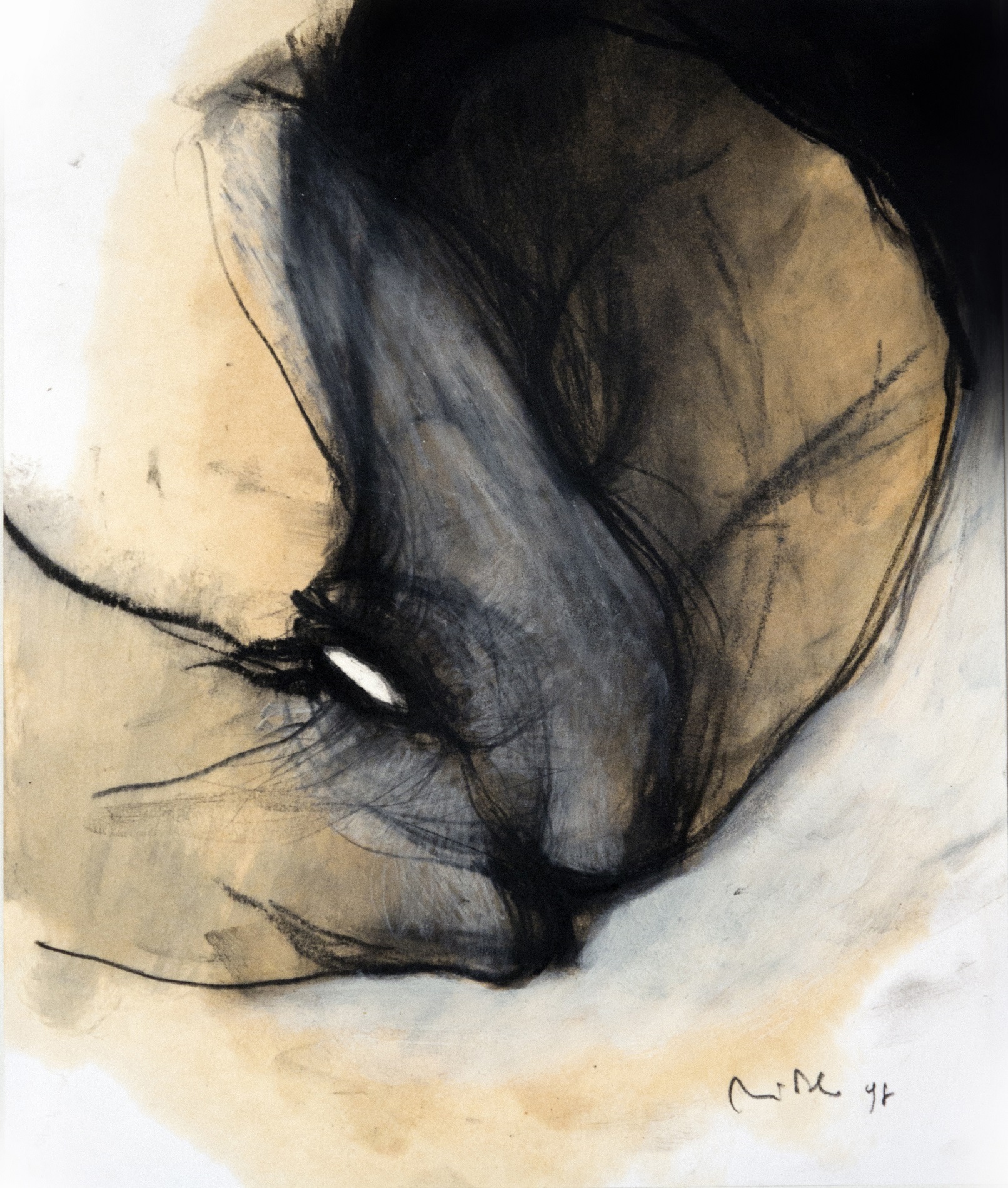 MITOLO EZIA Taranto 1966 “La caduta” Tecnica mista, pastelli ad olio ed acrilico su carta cm 25,9x20 del 1998. Firmato e datato sul fronte in basso a destra. Sul retro etichetta con firma e titolo.