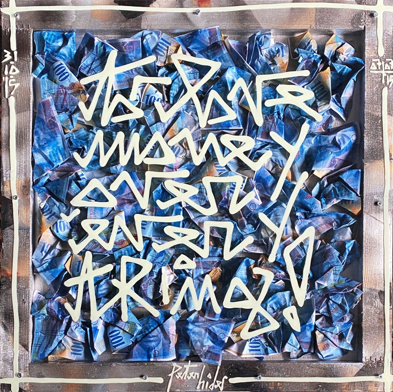 PETER HIDE Varese 1965 “The love Money over everything” tecnica mista, banconote (fac simile) su tela con copertura in plexiglass dipinta con acrilico fosforescente (glowing in the dark) cm 50x50x5 del 2015. Sul retro firmato e datato Autentica su foto.