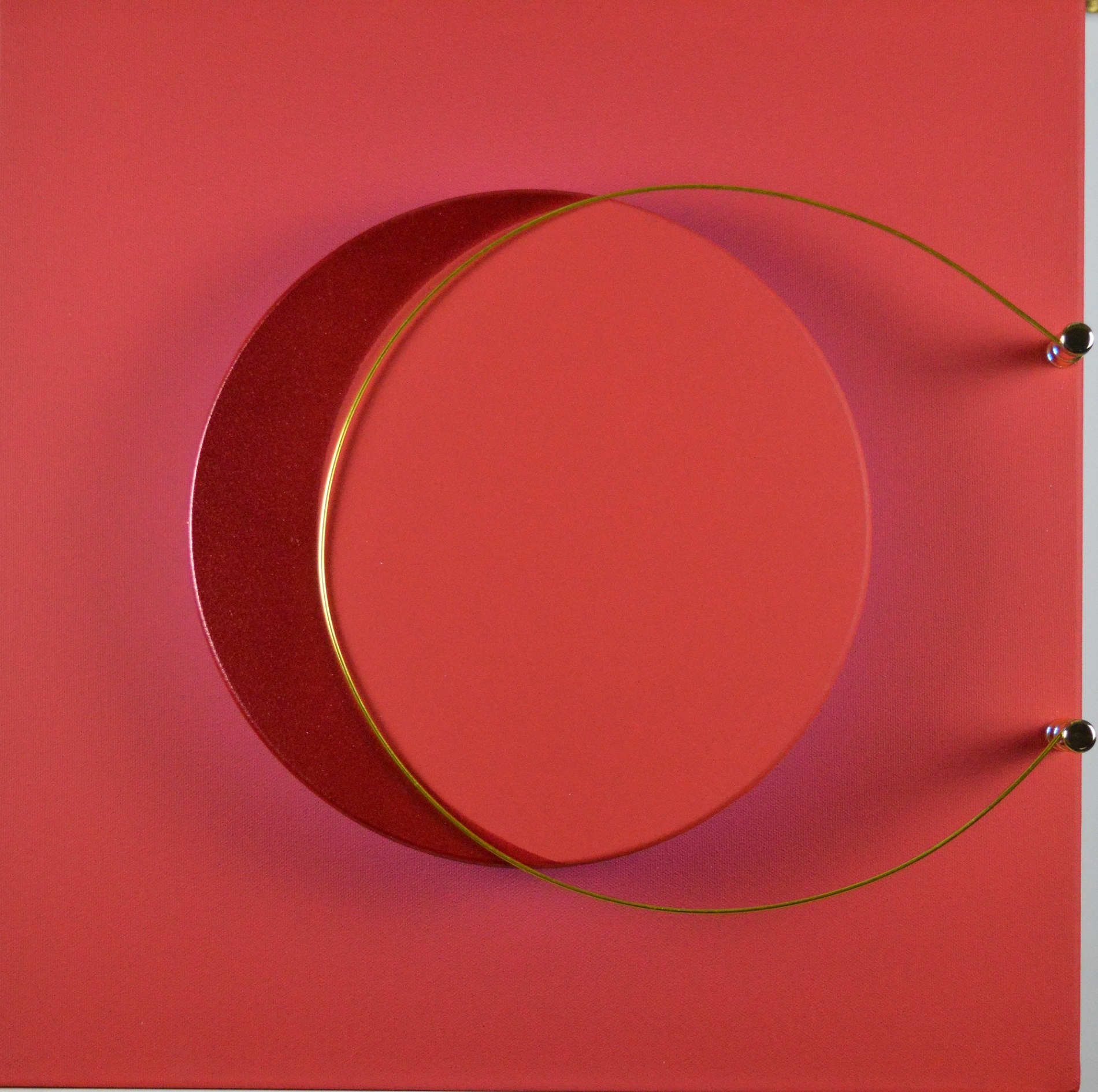 BANI BRUNO Milano 1964 “Eclissi Parziale Rossa” Due tele sovrapposte con sistema a led telecomandato e filo rigido in metallo, cm 50x50 del 2018. Sul retro numero d’archivio, titolo, data e firma. Autentica su foto dell’ artista e fotografie dell’artista con l’opera mentre la firma.
