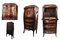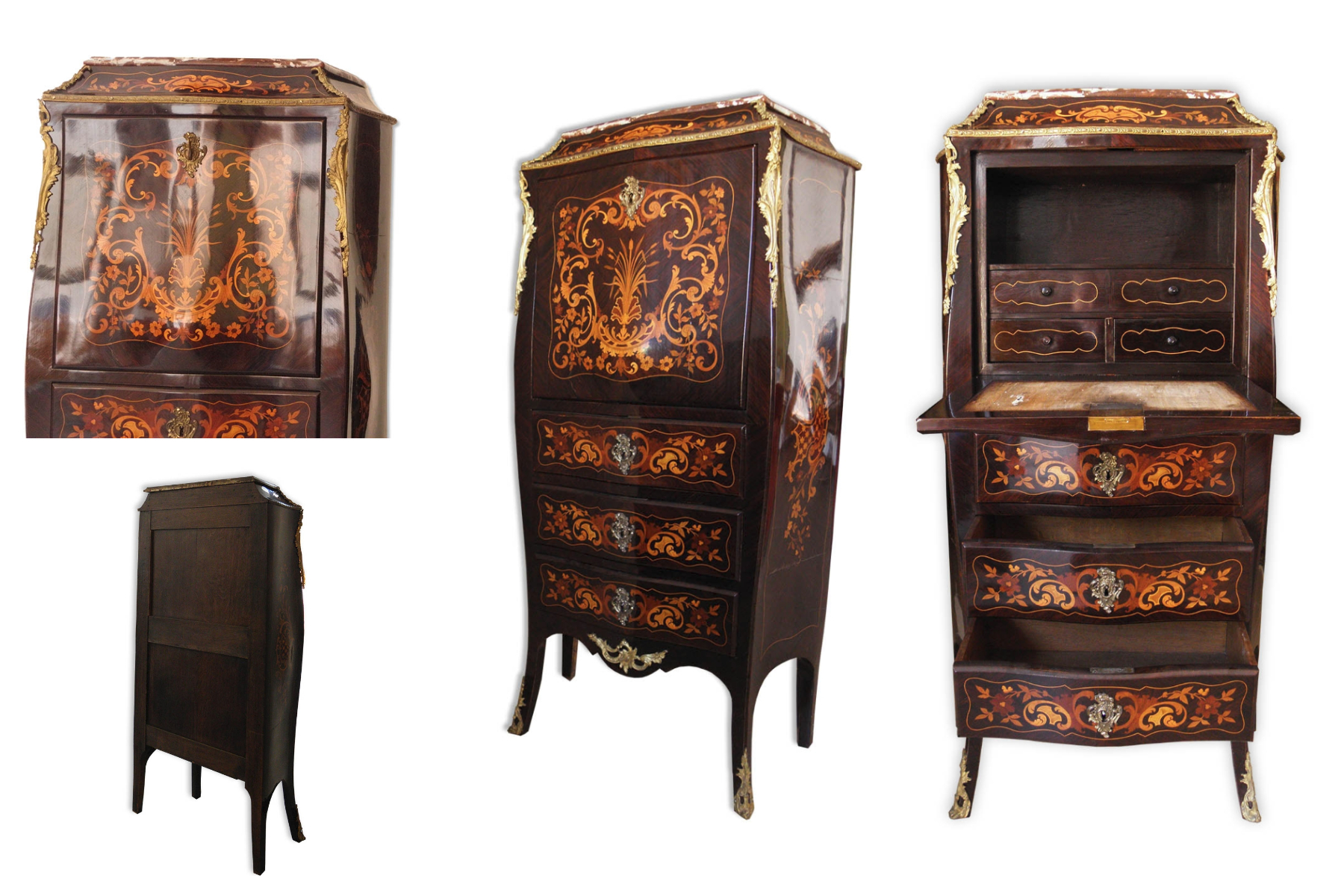 Secretaire francese in stile Napoleone III, elegantemente intarsiato e filettato in legni pregiati, ornamenti in bronzo cesellato e dorato. Secretaire a tre cassetti esterni più scrittoio a calatoia che cela cassettini e vani a giorno. Piano in marmo venato e smussato. Mobile di grande carattere e impatto con intarsi floreali e di gusto, manca di chiave ed ha un piccola lesione sul piano in marmo ma nel complesso è in buono stato conservativo. Dimensioni: H 132 cm, L 54 cm, P 30 cm.