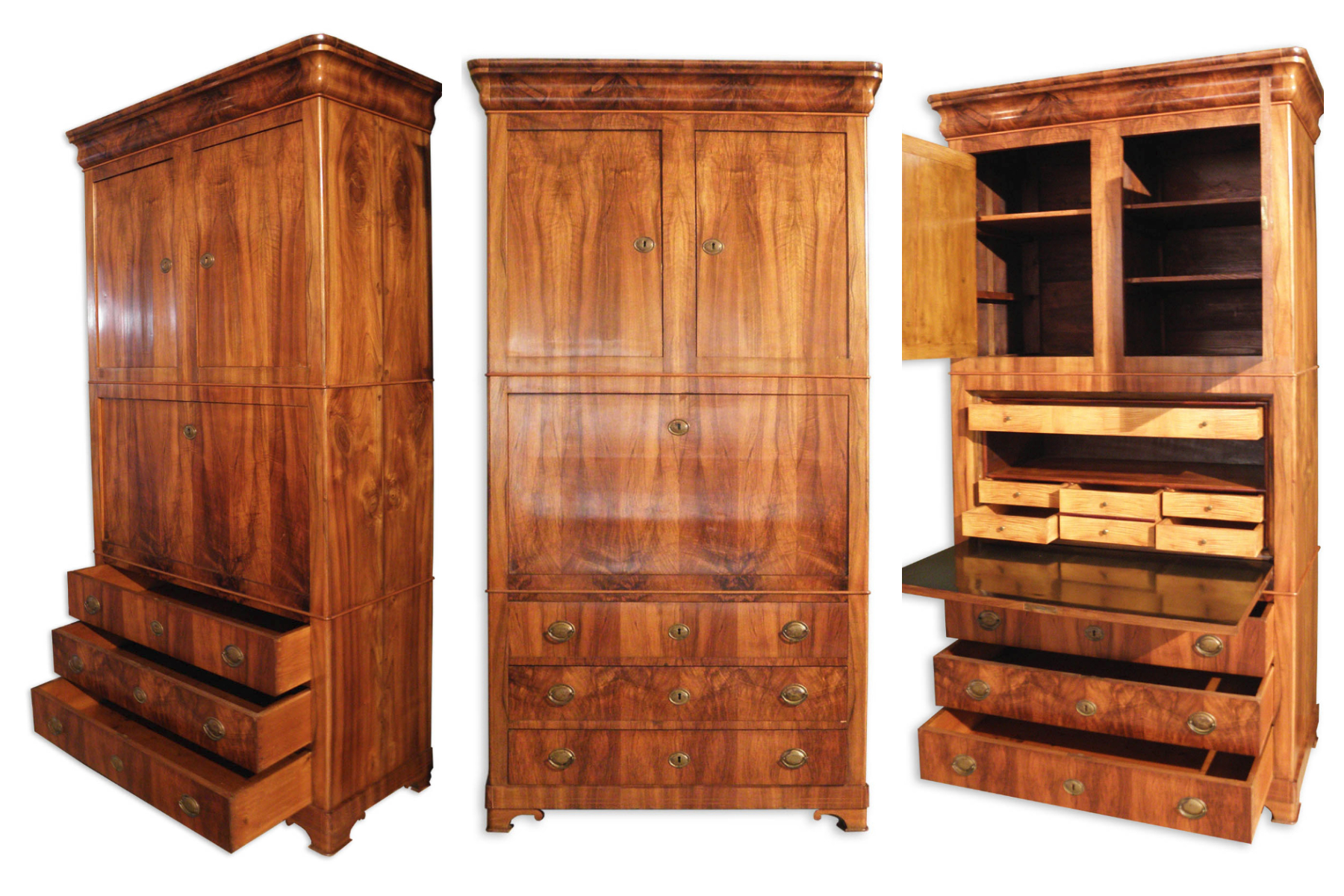 Particolare secretaire Cappuccino in stile Luigi Filippo, caratterizzato da linee classiche ed eleganti. Il mobile è in noce e radica di noce, presenta tre cassetti di ottima capacità, un’anta centrale ribaltabile che cela vano a giorno e cassettini di più dimensioni. La parte centrale è sormontata da due ante che racchiudono vani molto capienti. Cappello superiore con tipica mossa a tulipano.Tre chiavi per serrature perfettamente funzionanti. Il Secretaire è in ottimo stato conservativo. Dimensioni: H 230 cm, L 113 cm, P 53 cm.